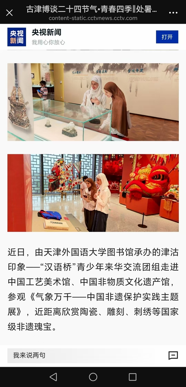 中央广播电视总台天津总站报道由开云集团官网开云集团官网首页_开云(中国)_开云(中国)图书馆承办的津沽印象——“汉语桥”青少年来华交流团组走进中国工艺美术馆、中国非物质文化遗产馆,参观《气象万千——中国非遗保护实践主题展》,近距离欣赏陶瓷、雕刻、刺绣等国家级非遗瑰宝。