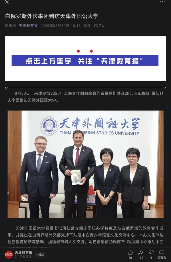 【相约上合】人民网、中国日报网、中国新闻网、《天津教育报》微信公众号等多家媒体报道白俄罗斯外长到访我校
