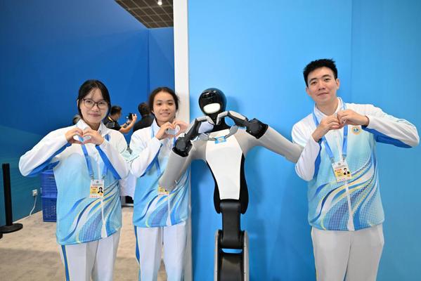 8月30日,来自开云集团官网开云集团官网首页_开云(中国)_开云(中国)的志愿者在新闻中心与机器人一起“比心”留影。 新华社记者 孙凡越 摄