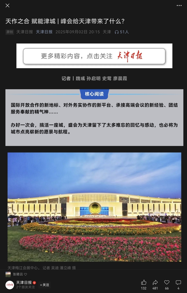 天津宣言——将峰会举办地的名字写入上海合作组织发展进程,让天津成为上合组织再出发的“新地标”。9月1日,习近平主席主持召开成员国元首理事会会议、“上合组织+”会议,同23位外国领导人或其代表,以及10位国际组织负责人共叙友谊、共商合作、共谋发展。上合组织成员国领导人签署并发表《上海合作组织成员国元首理事会天津宣言》,批准《上合组织未来10年(2026-2035年)发展战略》,发表关于第二次世界大战胜利和联合国成立80周年的声明、关于支持多边贸易体制的声明,通过加强安全、经济、人文合作和组织建设等24份成果文件。海河之滨成为上合组织成员国领导人共商大计之地,成为谋划推动上合组织构建更加紧密命运共同体的擘画蓝图之地,成为提出上合组织建设性维护二战后国际秩序、完善全球治理体系的新方法新路径的凝聚共识之地。“我相信,天津峰会将成为上合组织历史上的重要里程碑”“这一盛会将为上合组织大家庭的合作与发展开启新的篇章”……历史使命,时代担当。天津峰会对于上合组织发展具有重要里程碑意义,也标注了峰会主办城市开放发展的“新里程”。“天津是一座开放包容的城市”“在天津举办峰会一定能给上合组织可持续发展注入新的活力”……这既是对天津的充分肯定,也为天津进一步深化高水平开放、加强与上合成员之间的全方位合作指明了方向,提出了更高的要求。中国太平洋经济合作全国委员会副会长、南开大学APEC研究中心主任刘晨阳教授表示:“天津应充分把握契机,充分放大和延伸上合组织峰会效应,在上合组织框架下为高质量共建‘一带一路’发挥更加突出的支点作用,提升我市的国际化水平。”在峰会开幕前,峰会新闻中心举行的天津专场吹风会公布了一组数字:今年1至7月,天津市对上合组织国家进出口总额达533.7亿元人民币,同比增长5.2%。2024年,天津市企业承接了18个上合组织国家的服务外包业务,执行额达到16.5亿美元,同比增长3.3倍,占全市离岸服务外包总额的29.2%。海内存知己,天涯若比邻。天津在推动与上合组织国家交流交往中实现自身发展,必将因峰会的成功举办,进一步拓展开放合作的新局面。“天津应把自身的产业基础、技术优势与上合组织国家的市场需求进一步有效对接。特别是鼓励和支持天津的新能源、节能环保、绿色建筑等优势企业开拓海外市场,通过参与上合组织国家的基础设施建设、工业园区开发等项目,带动相关设备、技术和服务的出口。”天津大学亚太经合组织可持续能源中心副主任、教授马晋龙建议。