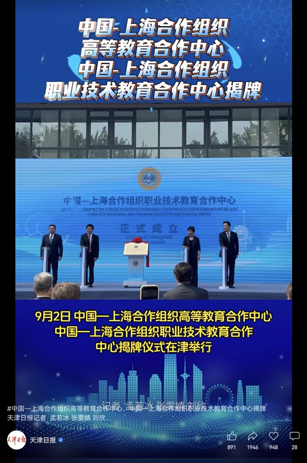 9月2日,中国—上海合作组织职业技术教育合作中心、绿色产业合作平台、数字经济合作平台揭牌仪式分别在天津职业技术师范大学、天津子牙经济技术开发区、天开高教科创园华苑片区举行。