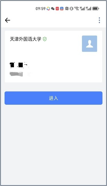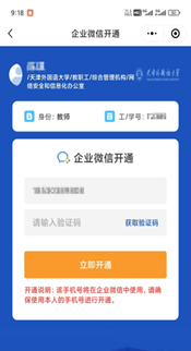 第一步,进入微信‘天外校园卡’小程序,点击右下角应用——‘开通企微’按钮(下图左)