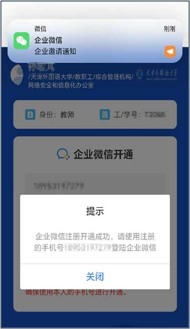 第四步,验证码核验完成后,将收到企业微信邀请(下图左),启动企业微信APP后,用注册的手机号登录即可使用企微(下图右)。