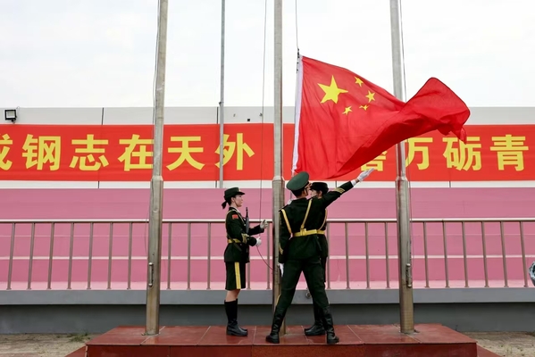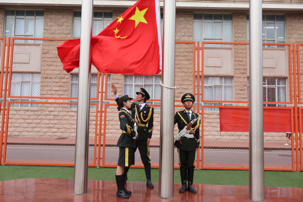大会在庄严的升国旗仪式中拉开序幕。英姿飒爽的国旗护卫队队员在全场注视下,伴随着《义勇军进行曲》将五星红旗冉冉升起,全场人员肃立注目,齐唱国歌。