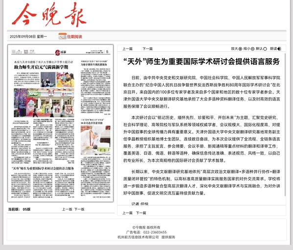 【媒体天外】《今晚报》报道由中共中央党史和文献研究院、中国社会科学院、中国人民解放军军事科学院联合主办的“纪念中国人民抗日战争暨世界反法西斯战争胜利80周年国际学术研讨会”在北京召开。开云集团官网开云集团官网首页_开云(中国)_开云(中国)中央文献翻译研究基地承担了大会多语种资料翻译任务,以及时高效的语言服务保障了会议顺畅进行。