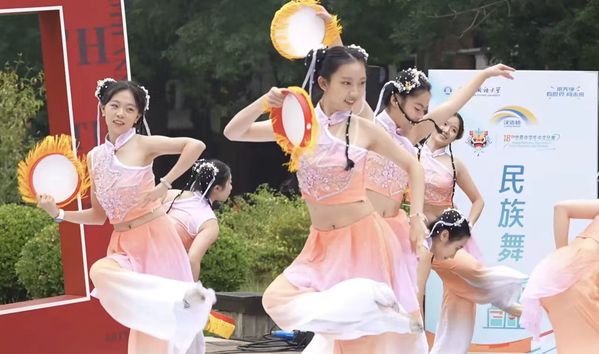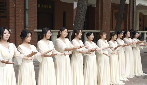 活动当天,校园内文化氛围浓厚。晨光中的钟楼尽显校园文脉底蕴,广场上各类文化展示活动依次开展:八段锦表演展现“天人合一”的中华哲学;天津快板以诙谐节奏呈现地方特色;小合唱旋律悠扬,传递文明互鉴理念;民族舞表演中,舞者身姿灵动,尽显东方美学;京剧表演则以铿锵锣鼓与经典唱腔,展现国粹魅力。多种传统文化形式与现代校园氛围交融,充分彰显学校作为文化交流平台的特色。