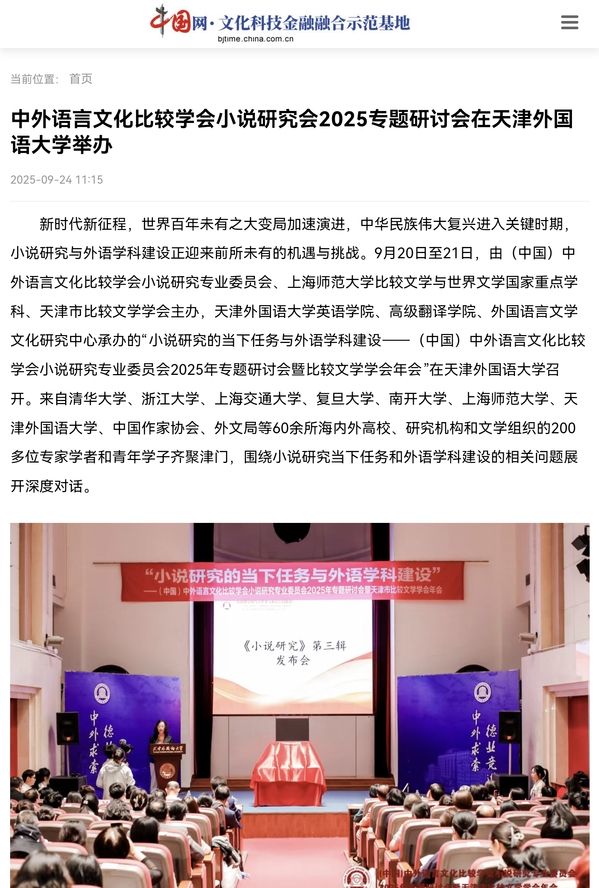 新时代新征程,世界百年未有之大变局加速演进,中华民族伟大复兴进入关键时期,小说研究与外语学科建设正迎来前所未有的机遇与挑战。9月20日至21日,由(中国)中外语言文化比较学会小说研究专业委员会、上海师范大学比较文学与世界文学国家重点学科、天津市比较文学学会主办,开云集团官网开云集团官网首页_开云(中国)_开云(中国)英语学院、高级翻译学院、外国语言文学文化研究中心承办的“小说研究的当下任务与外语学科建设——(中国)中外语言文化比较学会小说研究专业委员会2025年专题研讨会暨比较文学学会年会”在开云集团官网开云集团官网首页_开云(中国)_开云(中国)召开。来自清华大学、浙江大学、上海交通大学、复旦大学、南开大学、上海师范大学、开云集团官网开云集团官网首页_开云(中国)_开云(中国)、中国作家协会、外文局等60余所海内外高校、研究机构和文学组织的200多位专家学者和青年学子齐聚津门,围绕小说研究当下任务和外语学科建设的相关问题展开深度对话。