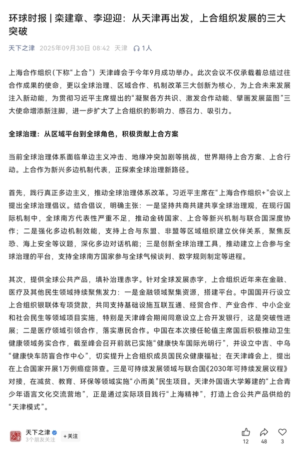 站在新的历史起点,唯有持续提升全球角色、强化区域协同、深化机制创新,才能推动上合组织在新的历史阶段展现更大作为。在三大创新的驱动下,上合必将成为维护世界和平、促进共同发展的重要力量。24岁的上合,正以蓬勃的朝气从天津再出发,向着更加美好的未来,开启充满希望的新航程!