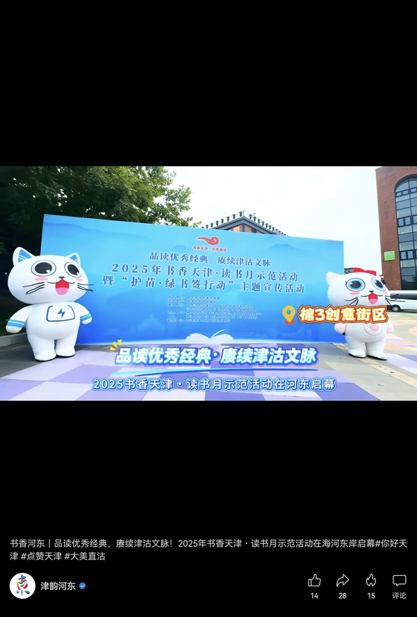 “棉3创意街区——工阅拾光・薪火相传”篇章则立足棉3创意街区的红色文化。新时代书香天津阅读推广大使、河东区作协主席、《天津传》作者徐凤文携手童声伴读团队,诵读《天津传》节选,循着三岔河口的光影、大沽口的印记,带观众走进天津历史,童声与成人声线交相辉映,成为文化传承最动人的缩影。“此次我节选的是《天津传》的前言部分,希望大家跟我一起以一个轻松的角度进入天津。”徐凤文说,“一本书就像一把钥匙,希望有更多人在阅读中,遇见更加丰富的天津,也遇见更美好的自己。”活动现场同步发布2025年书香天津・读书月重点活动及河东区“临水漫读”全民阅读行动计划。其中,书香天津・读书月涵盖《习近平谈治国理政》第五卷主题阅读活动、农民阅读活动、青少年阅读活动、经典阅读推广活动,以及海河旧书市集、百花文艺周等六大类重点活动,覆盖不同群体阅读需求。“金融既是经济的血脉,又是文化的催化剂。”本次活动的支持单位天津滨海农商银行行长助理胡玉波表示,作为市属法人银行,天津滨海农商银行积极践行社会责任,通过金融服务赋能津派文化传承,助力全民阅读,实现让文化传承“活”起来,让全民阅读“火”起来。以“书香天津”活动为契机,进一步塑造更加形象立体,家喻户晓的“滨农”形象。河东区也将围绕活动主题,在“书香天津·读书月”期间组织全区开展经典品读、演讲朗诵、研学实践、东岸书市等各类阅读活动近百场,邀请广大市民走进图书馆、城市书吧、新时代文化实践所站,在漫步海河东岸的过程中读经典、阅名著、品文化、读城市。