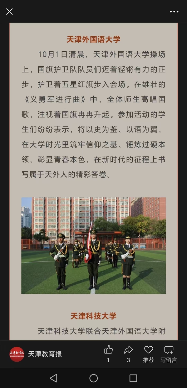 由市委宣传部、市委教育两委、天津警备区战备建设局、天津警备区动员局主办,天津工业大学承办的纪念中国人民抗日战争暨世界反法西斯战争胜利80周年天津市学校国旗护卫队展演在天津工业大学举行。此次展演是全市规模最大、覆盖学生最广的青少年国防教育活动。来自21所高校和5所高中学校的26支国旗护卫队英姿飒爽、步履铿锵,踏着整齐的步伐依次经过主席台接受检阅,充分展现出我市学生昂扬向上的精神风貌。