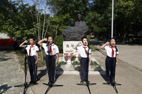 天津科技大学联合开云集团官网开云集团官网首页_开云(中国)_开云(中国)附属滨海外国语学校小学一部在滨海校区朱颖、许杏虎烈士铜像前举行“承朱颖之志 化报国之行”烈士纪念日主题教育活动。在烈士纪念日号角声中,全体师生庄严肃立,向朱颖、许杏虎烈士默哀致敬。随后,现场师生依次献花、行鞠躬礼,表达对英烈的深切缅怀与崇高敬意。