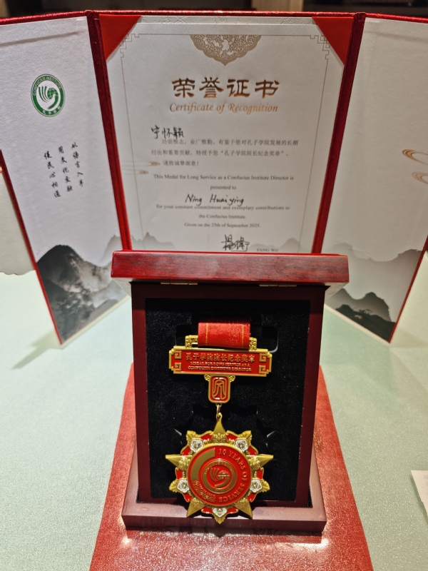 近日,在北京举办的2025年全球“孔子学院日”活动上,中国国际中文教育基金会向全球17位任职超过十年的杰出孔子学院院长颁发“孔子学院院长纪念奖章”,以表彰他们对国际中文教育及孔子学院发展的卓越贡献。我校与俄罗斯伏尔加格勒国立社会师范大学合作共建的孔子学院中方院长宁怀颖获此殊荣。