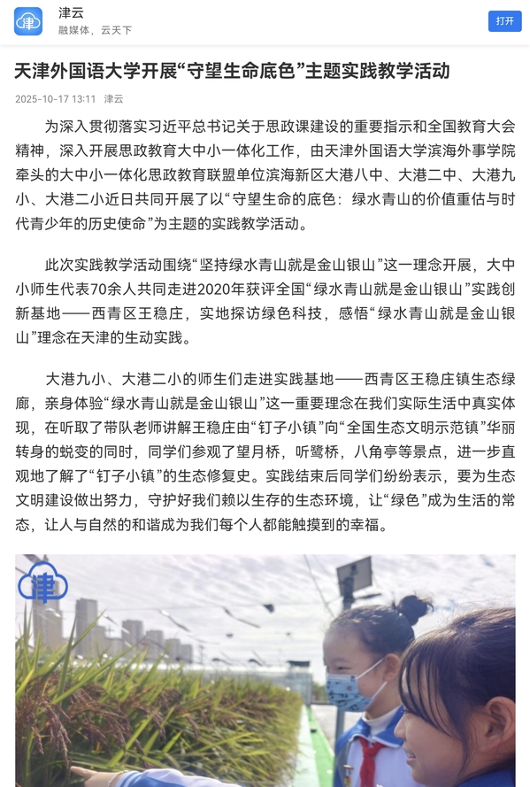 为深入贯彻落实习近平总书记关于思政课建设的重要指示和全国教育大会精神,深入开展思政教育大中小一体化工作,由开云集团官网开云集团官网首页_开云(中国)_开云(中国)滨海外事学院牵头的大中小一体化思政教育联盟单位滨海新区大港八中、大港二中、大港九小、大港二小近日共同开展了以“守望生命的底色:绿水青山的价值重估与时代青少年的历史使命”为主题的实践教学活动。