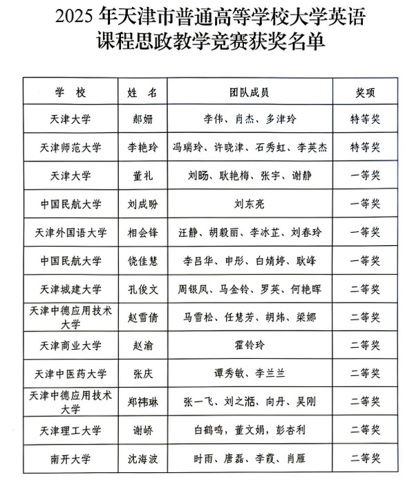 本次竞赛由天津市教育委员会主办,天津大学承办,高等教育出版社协办,旨在深入推进大学英语教学与课程思政的有机融合,全面落实立德树人根本任务。竞赛面向天津市各高校大学英语教学团队,要求围绕指定教学单元进行完整的课程思政教学设计,充分挖掘语言素材中的育人元素,实现价值引领、知识传授与能力培养的协同统一。决赛阶段,各参赛团队现场抽取命题,在规定时间内完成教学设计并进行全英文说课展示,全面考查教师的思政融入能力、临场应变与专业素养。
