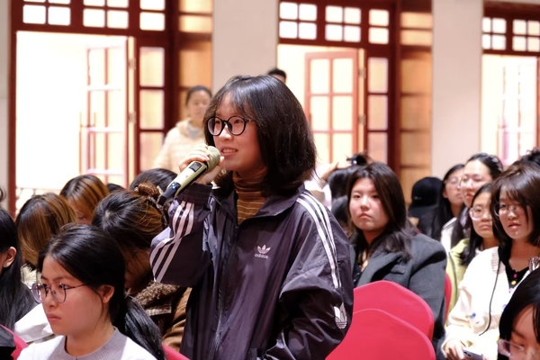 在提问环节,现场学生围绕郝力云的创业经历、外语专业学生如何更好发挥自身优势、外贸行业发展前景等话题进行了踊跃提问,郝力云逐一进行了解答。来自2022级翻译专业的唐若宇同学说:“听了郝老师的分享后,我学到了许多实战经验,特别是郝老师为了钻研一个复杂的商业模式,曾将一张思维导图反复打磨十几遍,直到彻底看清其底层逻辑。正是这份不畏艰难的创业韧劲让我感受到了女性创业者的巨大力量,备受鼓舞。”