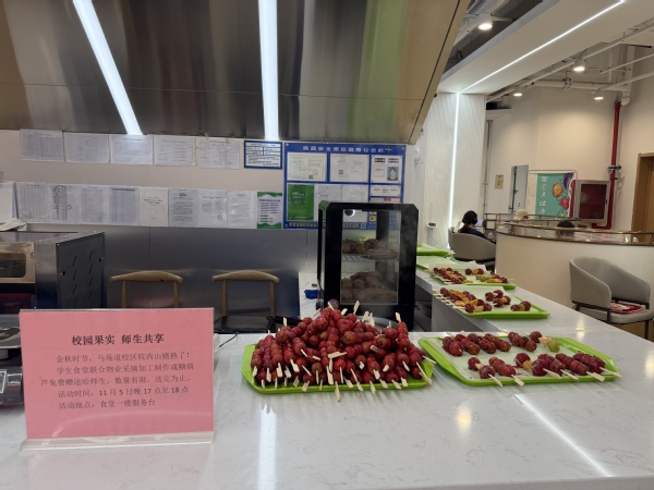 经过校园物业一年的精心培育,山楂挂满枝头,校园物业师傅们将新鲜采摘、色泽饱满的山楂送往学生食堂,由食堂的厨师们给这些红果“洗澡”“裹糖衣”,制作成一串串酸甜可口的冰糖葫芦。于11月4日至5日晚餐时段,将这些充满心意的冰糖葫芦免费送给前来就餐的师生。