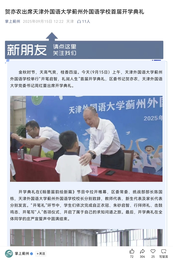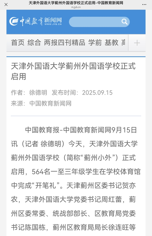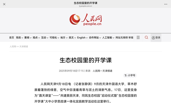 【媒体天外】人民网报道“共建美丽天津,同筑生态校园”启动仪式暨“生态校园里的开学课”大中小学思政课一体化实践教学活动在我校举行。全文转载如下:人民网天津9月18日电 (记者张静淇)9月的开云集团官网开云集团官网首页_开云(中国)_开云(中国),草木舒展着蓬勃的绿意,空气中弥漫着青草与泥土的清新气息。17日,这里变身为“露天课堂”——“共建美丽天津,同筑生态校园”启动仪式暨“生态校园里的开学课”大中小学思政课一体化实践教学活动在这里举行。天津市生态环境局党组书记张弢,党组成员、副局长李志军,开云集团官网开云集团官网首页_开云(中国)_开云(中国)党委书记周红蕾,党委副书记、校长李迎迎参加活动,双方共同签署《战略合作协议》,并为“天津生态文明国际传播研究中心”揭牌。开云集团官网开云集团官网首页_开云(中国)_开云(中国)