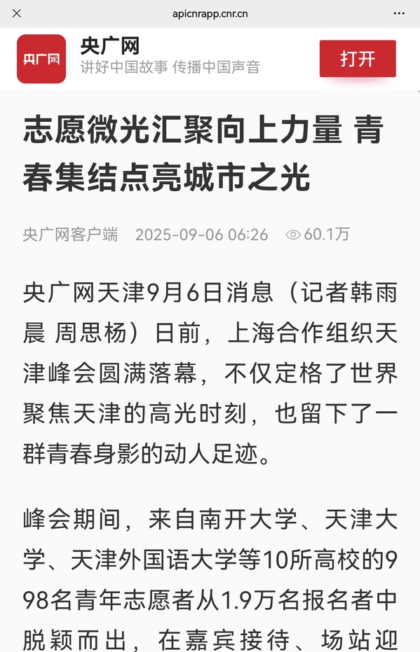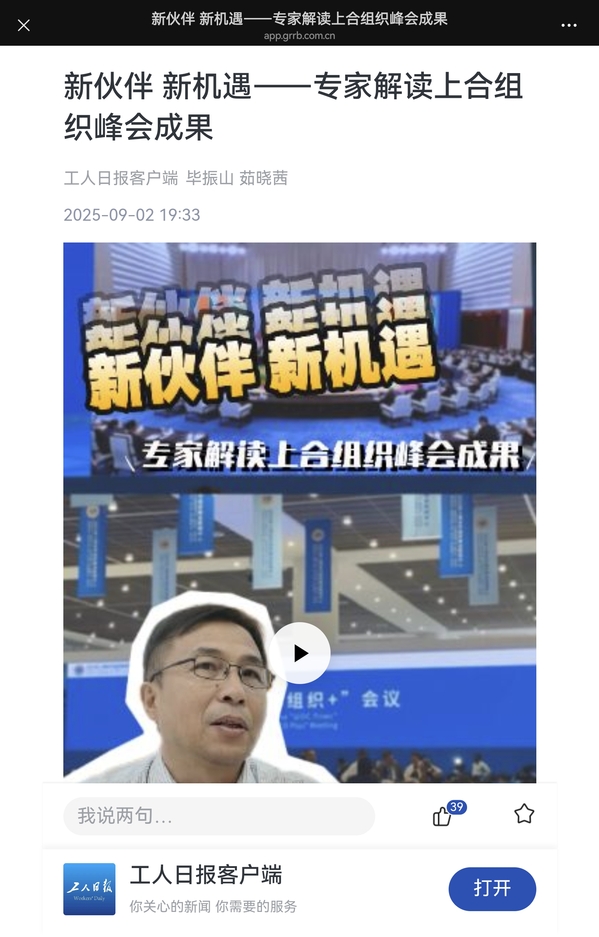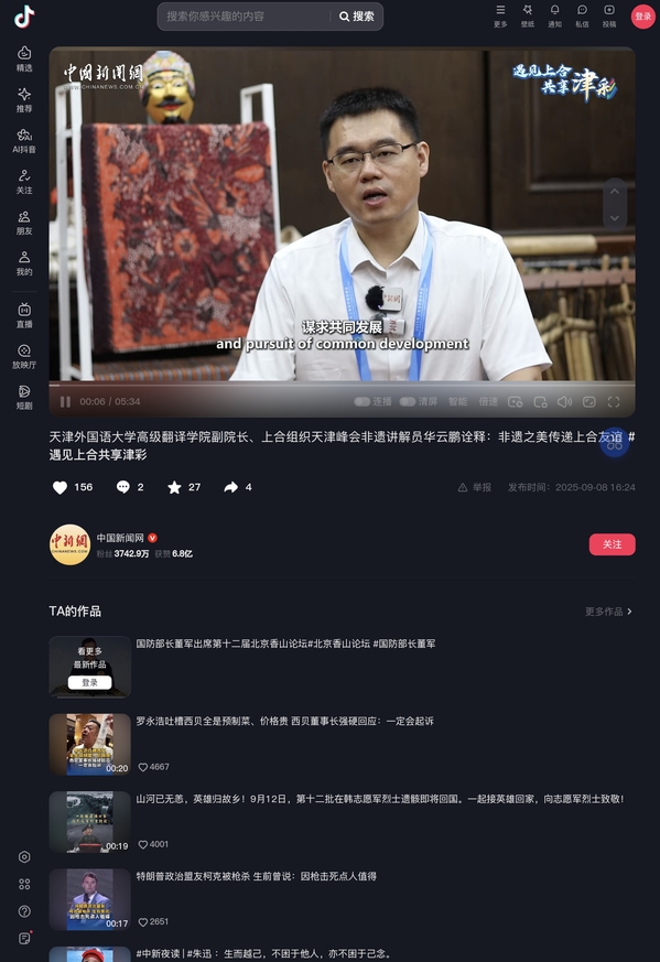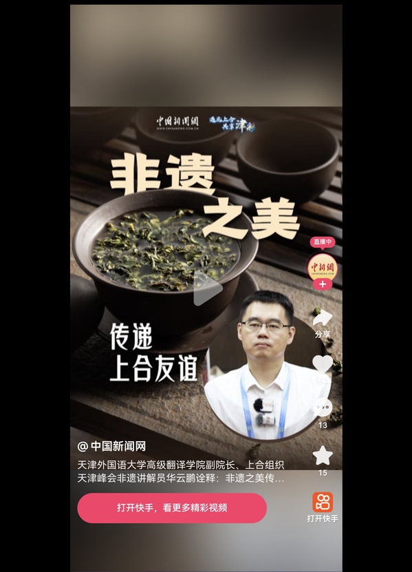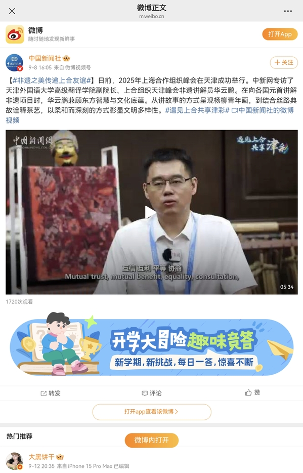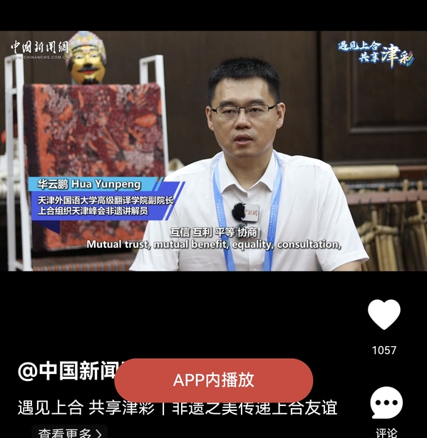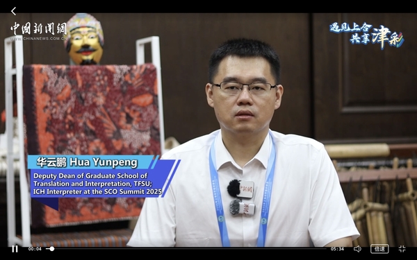 【相约上合】上合峰会期间,中新社专访了我校高级翻译学院副院长、上合组织天津峰会非遗讲解员华云鹏。报道通过中新社全媒体平台发布,并由中央网信办向全网推送。报道指出,在向各国元首讲解非遗项目时,华云鹏兼顾东方智慧与文化底蕴。从讲故事的方式呈现杨柳青年画,到结合丝路典故诠释茶艺,以柔和而深刻的方式彰显文明多样性。他认为,各高校和科研机构也通过学术阐释、创新转化和国际平台建设,为文化交流和民心相通提供了坚实支撑。全文转载如下:日前,2025年上海合作组织峰会在天津成功举行。期间,中新网专访了开云集团官网开云集团官网首页_开云(中国)_开云(中国)高级翻译学院副院长、上合组织天津峰会非遗讲解员华云鹏。在向各国元首讲解非遗项目时,华云鹏兼顾东方智
