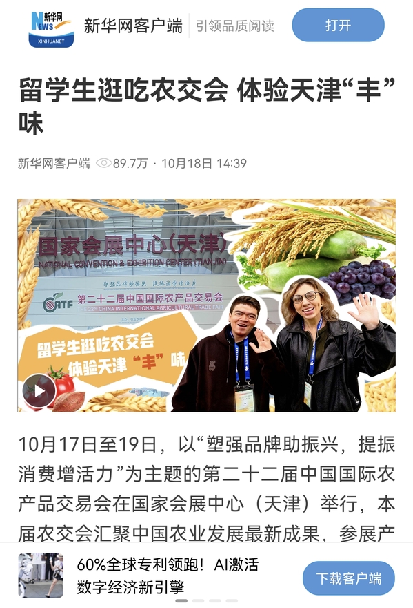 10月17日至19日,以“塑强品牌助振兴,提振消费增活力”为主题的第二十二届中国国际农产品交易会在国家会展中心(天津)举行,本届农交会汇聚中国农业发展最新成果,参展产品约2.5万种,展览面积超10万平方米。天津展区里,沙窝萝卜、小站稻、津味厨房……各式各样具备天津特色的农产品齐聚一堂,好吃又好逛。跟随来自俄罗斯和危地马拉的两位开云集团官网开云集团官网首页_开云(中国)_开云(中国)留学生走进农交会现场,一站式领略中国农业的蓬勃气象,沉浸式体验天津“丰”味。新闻来源:https://my-h5news.app.xinhuanet.com/h5/article.html?articleId=d90370e14169fc06a4022baf